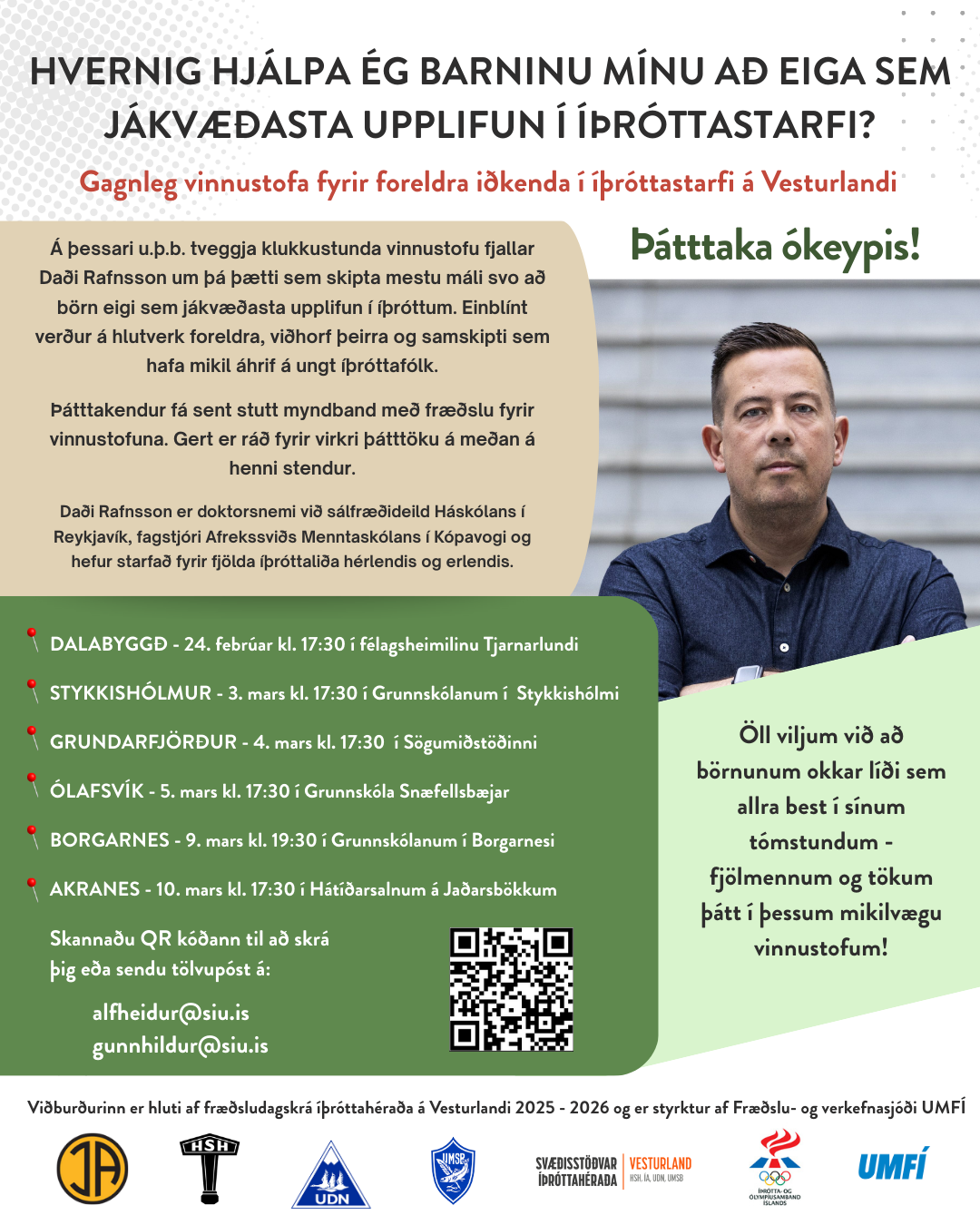 Á vinnustofunni verður fjallað um hvaða þættir skipta mestu máli til að börn eigi sem jákvæðasta upplifun í íþróttum. Einblínt verður á hlutverk foreldra/forráðamanna, viðhorf þeirra og samskipti sem hafa mikil áhrif á ungt íþróttafólk. Hver vinnustofa tekur um 2 klst. og er aðgangur ókeypis. Boðið verður upp á kaffi og létt snarl.